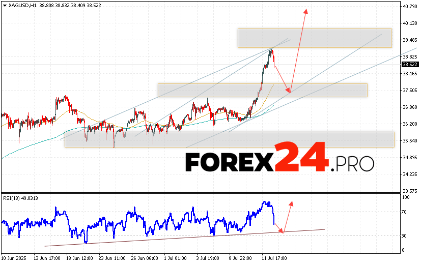 Silver Forecast XAG/USD for July 15, 2025 suggests an attempt to test the support area near the level of 37.45. Further, the quotes will continue to grow with a target above the 40.65 level. A fall and breakout of the 36.55 level will cancel the option of a rise in silver prices. This will indicate a breakout of the support area. In this case, we should expect a continuation of the fall in the price of silver with a target at the 34.25 level.