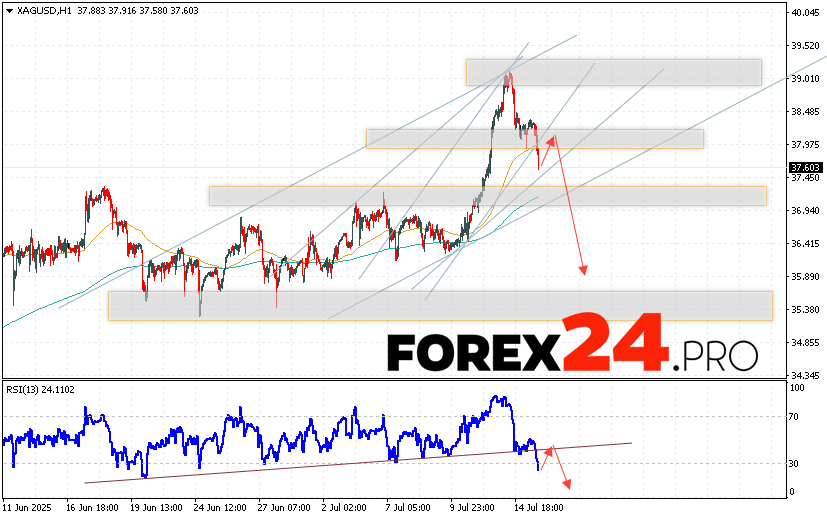 An additional signal in favor of a decline in quotes and prices for silver XAG/USD will be a test of the resistance line on the relative strength indicator (RSI). The second signal in favor of an increase will be a rebound from the lower border of the bullish channel. A strong increase and a breakout of 38.75 will cancel the option of a fall in silver prices on July 16, 2025. This will indicate a breakout of the resistance area and a continuation of growth to an area above the level of 39.95. An acceleration in the decline in XAG/USD quotes should be expected with a breakout of the support area below the 37.25 level, which will indicate a breakout of the lower border of the bullish channel.
