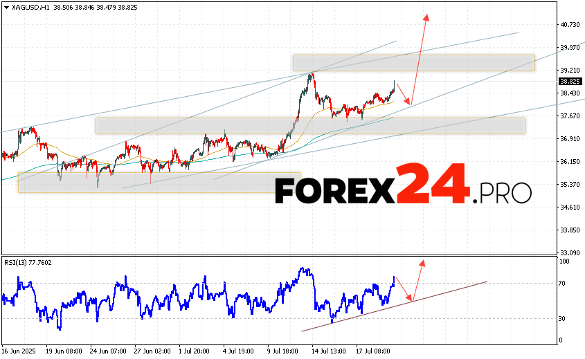 Silver Forecast XAG/USD for July 22, 2025 suggests an attempt to test the support area near the level of 38.05. Further, the quotes will continue to grow with a target above the level of 40.85. A decline and breakout of the 37.25 level will cancel the option of a rise in silver prices. This will indicate a breakout of the support area. In this case, we should expect a continuation of the decline in silver prices with a target at 35.45.