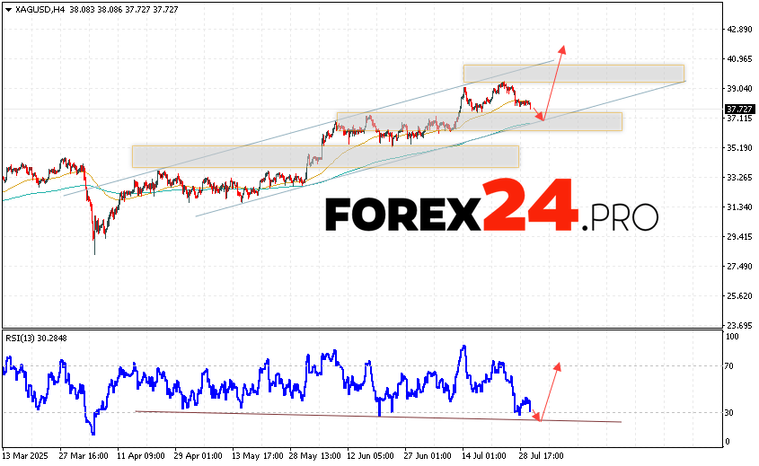 Silver Forecast XAG/USD for July 31, 2025 suggests an attempt to test the support area near the level of 36.85. Further, the quotes will continue to grow with a target above the level of 41.65. A decline and breakout of the 35.85 level will cancel the option of a rise in silver prices. This will indicate a breakout of the support area. In this case, we should expect a continuation of the decline in the price of silver with a target at 34.05.