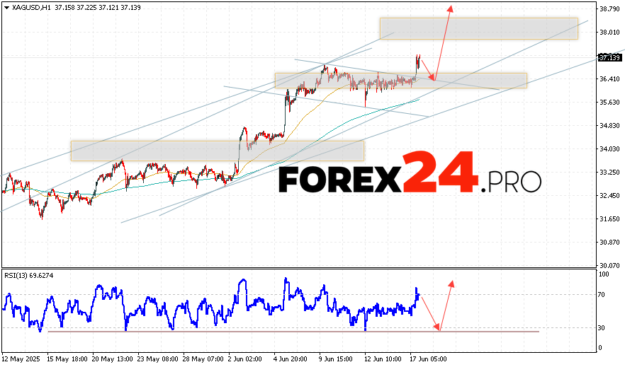 Silver Forecast XAG/USD for June 18, 2025 suggests an attempt to test the support area near the 36.45 level. Further, the quotes will continue to rise with a target above the 39.15 level. A decline and breakout of the 34.65 level will cancel the option of a rise in silver prices. This will indicate a breakout of the support area. In this case, we should expect a continuation of the decline in the price of silver with a target at the 33.15 level.