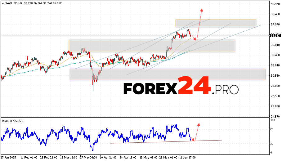 Silver Forecast XAG/USD for June 20, 2025suggests an attempt to test the support area near the level of 36.15. Further, the quotes will continue to rise with a target above the level of 39.65. A decline and breakout of the 34.25 level will negate the possibility of a rise in silver prices. This will indicate a breakout of the support area. In this case, we can expect a continued decline in the price of silver with a target of 32.35.