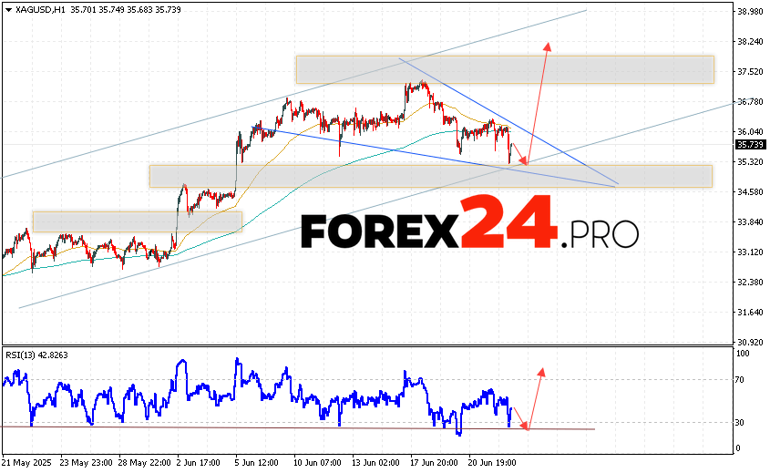 Silver Forecast XAG/USD for June 25, 2025 suggests an attempt to test the support area near the 35.15 level. Further, the quotes will continue to grow with a target above the 38.25 level. A decline and breakout of the 34.25 level will cancel the option of a rise in silver prices. This will indicate a breakout of the support area. In this case, we should expect a continuation of the decline in the price of silver with a target at 32.65.