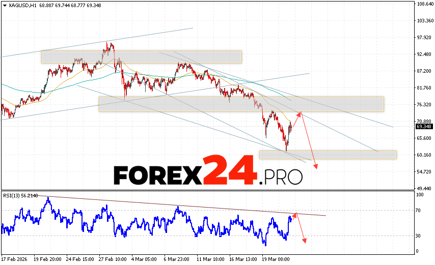 Silver Forecast XAG/USD for March 24, 2026 suggests an attempt to test the resistance area near 71.35. A subsequent downward rebound and continued decline in silver with a target below 54.85 are expected. A strong rally and a breakout of 82.05 would cancel out the downward trend in silver. This would indicate a breakout of the resistance area. In this case, a continued rise in silver with a target of 86.75 is expected.
