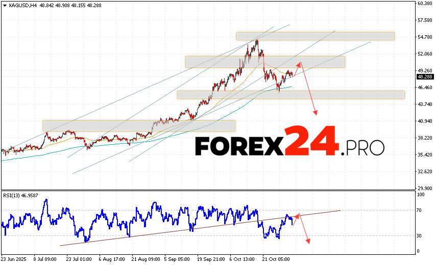 An additional signal favoring a decline in Silver XAG/USD quotes and prices will be a test of the resistance line on the relative strength indicator (RSI). A second signal favoring a decline will be a rebound from the lower boundary of the bullish channel. A strong rally and a breakout of 50.85 would cancel the downward trend in Silver on November 4, 2025. This would indicate a breakout of the resistance area and continued growth above 52.65. We should expect an acceleration of the decline in XAG/USD quotes with a breakout of the support area and a consolidation below 46.75.