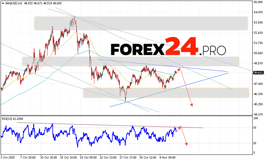 Silver Forecast XAG/USD for November 7, 2025 suggests an attempt to test the resistance area near 48.95. Next, a continued decline in quotes with a target below 45.15 is expected. A strong rally and a breakout of 50.35 would cancel out this downward trend in silver prices. This would indicate a breakout of the resistance area. In this case, we should expect a continued rise in silver prices with a target of 52.65.