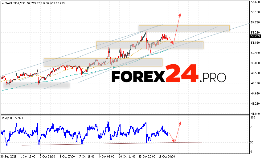 Silver Forecast XAG/USD for October 16, 2025 suggests an attempt to test the support area near 51.75. Further growth is expected with a target above 56.25. A decline and a breakout of 49.75 would cancel out the upward trend for silver. This would indicate a breakout of the support area. In this case, we should expect continued decline in silver with a target of 46.85.