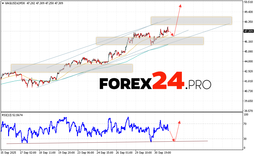 Silver Forecast XAG/USD for October 2, 2025 suggests an attempt to test the support area near 46.95. Subsequently, we expect continued growth with a target above 49.65. A decline and a break of 45.75 would cancel out the upward trend for silver. This would indicate a break of the support area. In this case, we should expect continued decline in silver with a target of 44.25.