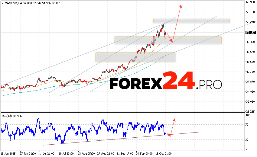 An additional signal favoring an increase in Silver XAG/USD quotes and prices will be a test of the support line on the relative strength indicator (RSI). A second signal favoring an uptrend will be a rebound from the lower boundary of the bullish channel. A decline and a breakout of 47.05 would cancel the upward trend for Silver on October 21, 2025. This would indicate a breakout of the support area and a continuation of the decline below 45.15. We expect an acceleration in XAG/USD price growth with a breakout of the resistance area and a consolidation above 53.85.