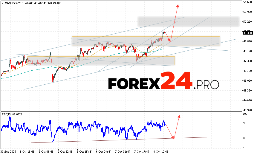 Silver Forecast XAG/USD for October 9, 2025 suggests an attempt to test the support area near 48.65. Further growth is expected with a target above 51.45. A decline and a breakout of 48.15 would cancel out the upward trend for silver. This would indicate a breakout of the support area. In this case, we should expect continued decline in silver with a target of 46.75.