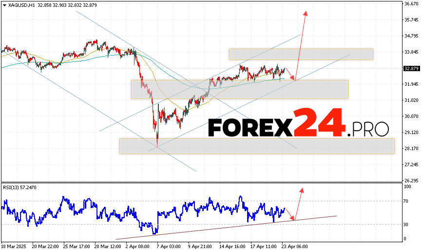 Silver Forecast XAGUSD for April 24, 2025 suggests an attempt to test the support area near the level of 32.05. Further, the continuation of the growth of quotes with a target above the level of 35.75. The cancellation of the option of increasing prices for Silver will be a fall and a breakout of the level of 31.35. This will indicate a breakout of the support area. In this case, we should expect a continuation of the decline in the price of Silver with a target at the level of 29.25.