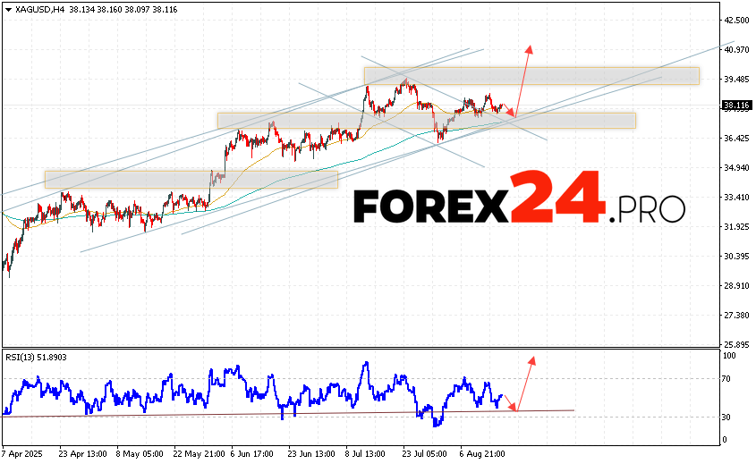 An additional signal in favor of the growth of quotes and prices for Silver XAG/USD will be a test of the support line on the relative strength indicator (RSI). The second signal in favor of a fall will be a rebound from the lower border of the bullish channel. The cancellation of the option of growth in prices for Silver on August 19, 2025 will be a fall and a breakout of 36.55. This will indicate a breakout of the support area and a continuation of the fall to the area below the level of 34.25. We should expect an acceleration of the growth of XAG/USD quotes with a breakout of the resistance area and consolidation above the level of 38.65.