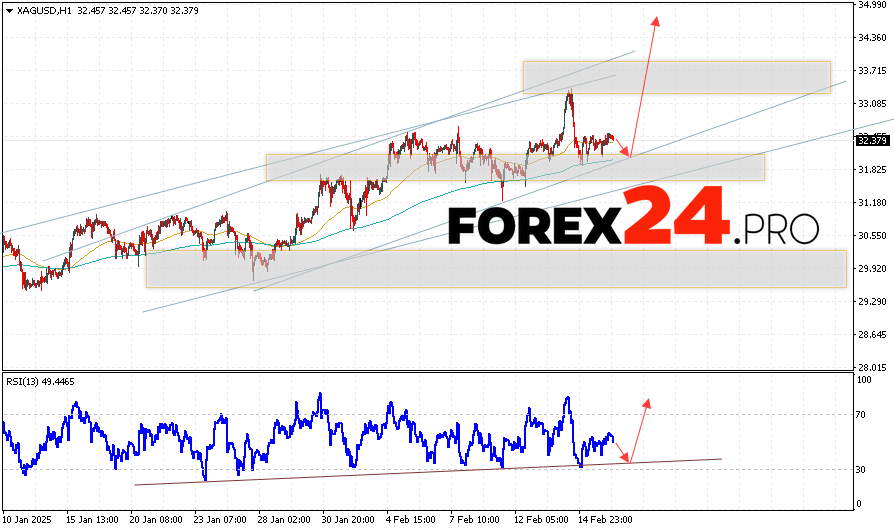 Silver Forecast XAGUSD for February 19, 2025 suggests an attempt to test the support area near the level of 32.05. Further, the continuation of the growth of quotes with a target above the level of 34.65. The cancellation of the option of increasing prices for Silver will be a fall and a breakout of the level of 31.15. This will indicate a breakout of the support area. In this case, one should expect a continuation of the decline in the price of Silver with a target at the level of 29.75.