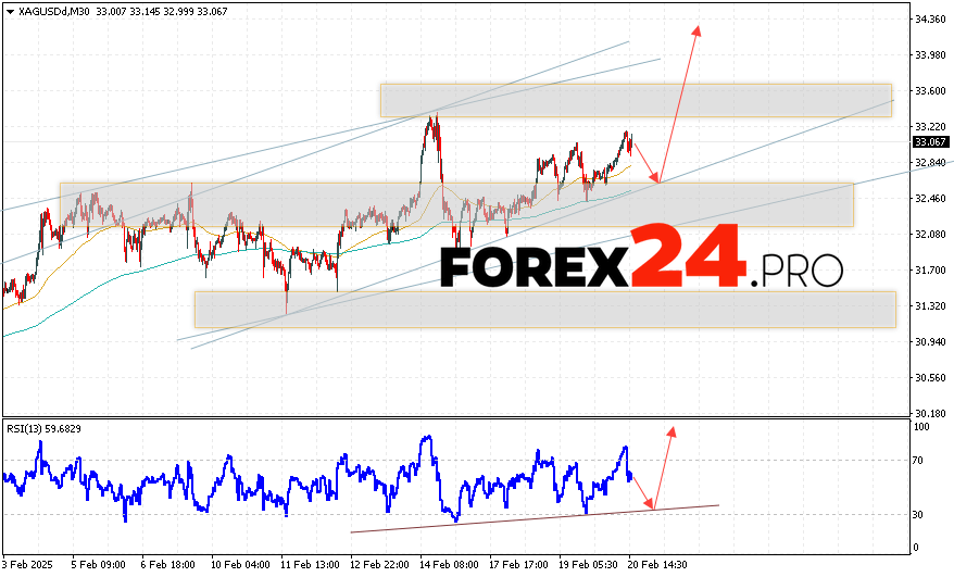 Silver Forecast XAGUSD for February 21, 2025 suggests an attempt to test the support area near the level of 32.65. Further, the continuation of the growth of quotes with a target above the level of 34.05. The cancellation of the option of increasing prices for Silver will be a fall and a breakout of the level of 32.25. This will indicate a breakout of the support area. In this case, we should expect a continuation of the decline in the price of Silver with a target at the level of 29.75.