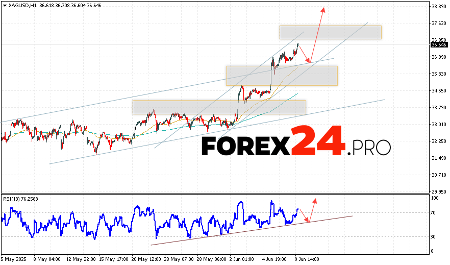 Silver Forecast XAGUSD for June 10, 2025 suggests an attempt to test the support area near the 35.95 level. Further, the quotes will continue to rise with a target above the 38.45 level. A decline and breakout of the 35.05 level will cancel the option of a rise in silver prices. This will indicate a breakout of the support area. In this case, we should expect a continuation of the decline in the price of silver with a target at the 33.45 level.