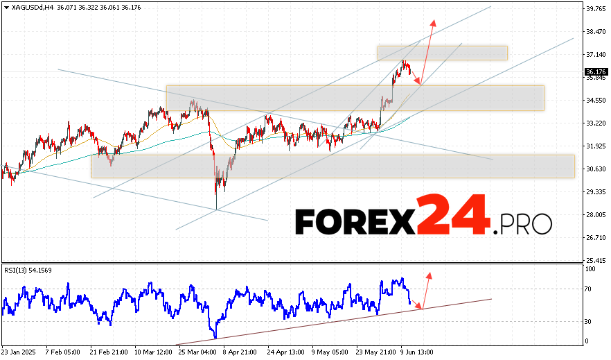 Silver Forecast XAG/USD for June 12, 2025 suggests an attempt to test the support area near the 35.75 level. Further, the quotes will continue to grow with a target above the level of 38.65. A fall and breakout of the level of 34.35 will cancel the option of a rise in silver prices. This will indicate a breakout of the support area. In this case, we should expect a continuation of the decline in the price of silver with a target at the level of 32.85.