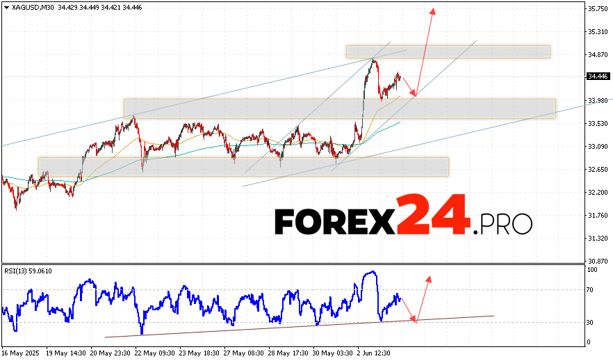 Silver Forecast XAG/USD for June 4, 2025 anticipates an attempt to test the support area close to the level of 34.05. Subsequently, continuation of price quotations rise towards a target above the level of 35.85. Cancellation of the option of price increase on Silver will be a drop and penetration of the level of 33.45. This indicates a breakthrough the support area. In this case, one should expect further decline in the Silver price with a target at the level of 31.35.