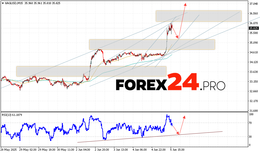 Silver Forecast XAG/USD for June 6, 2025 suggests an attempt to test the support area near the 35.25 level. Further, the quotes will continue to rise with a target above the 37.35 level. A decline and breakout of the 34.55 level will negate the possibility of a rise in silver prices. This will indicate a breakout of the support area. In this case, we can expect a continued decline in the price of silver with a target of 32.95.