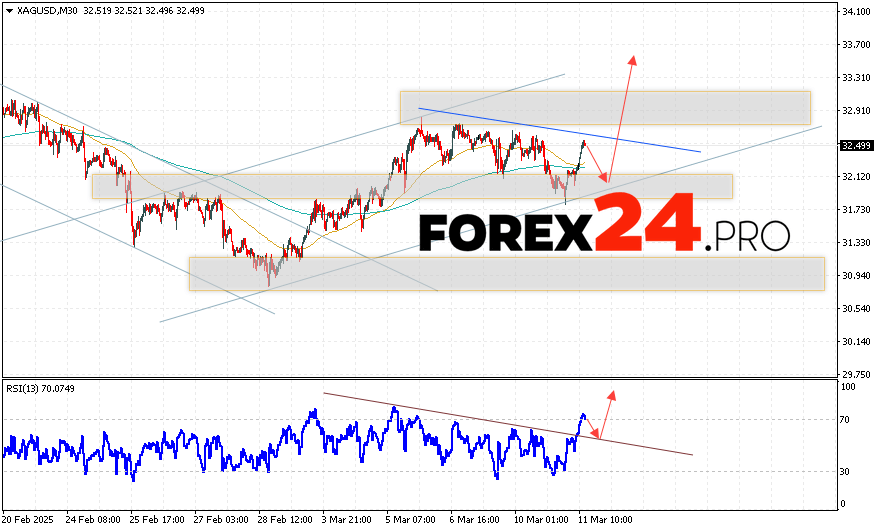 Silver Forecast XAGUSD for March 12, 2025 suggests an attempt to test the support area near the level of 32.05. Further, the continuation of the growth of quotes with a target above the level of 33.65. The cancellation of the option of increasing prices for Silver will be a fall and a breakout of the level of 31.25. This will indicate a breakout of the support area. In this case, we should expect a continuation of the fall in the price of Silver with a target at the level of 29.95.