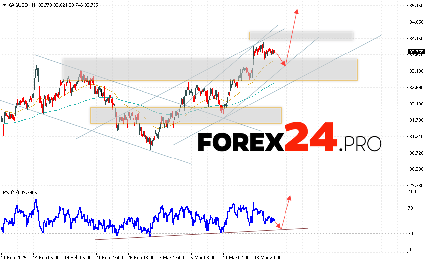 Silver Forecast XAGUSD for March 18, 2025 suggests an attempt to test the support area near the level of 33.35. Further, the continuation of the growth of quotes with a target above the level of 34.85. The cancellation of the option of increasing prices for Silver will be a fall and a breakout of the level of 32.35. This will indicate a breakout of the support area. In this case, we should expect a continuation of the fall in the price of Silver with a target at the level of 28.65.