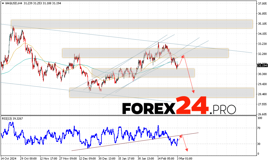Silver Forecast XAGUSD for March 4, 2025 suggests an attempt to test the resistance area near 32.15, followed by a continuation of the decline to a target below 28.45. A scenario invalidation would be strong growth and a breakout of 33.45, indicating a continuation of the upward movement with a target at 35.05.