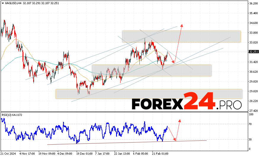 An additional signal in favor of growth in quotes and prices for Silver XAG/USD will be a test of the support line on the relative strength indicator (RSI). The second signal in favor of growth will be a rebound from the lower border of the bullish channel. The cancellation of the option of rising prices for Silver on March 6, 2025 will be a fall and a breakout of 30.35. This will indicate a breakout of the support area and a continuation of the fall to the area below the 29.05 level. We should expect an acceleration of growth in XAG/USD quotes with a breakout of the resistance area above the 32.45 level, which will indicate a breakout of the upper border of the descending correction channel.