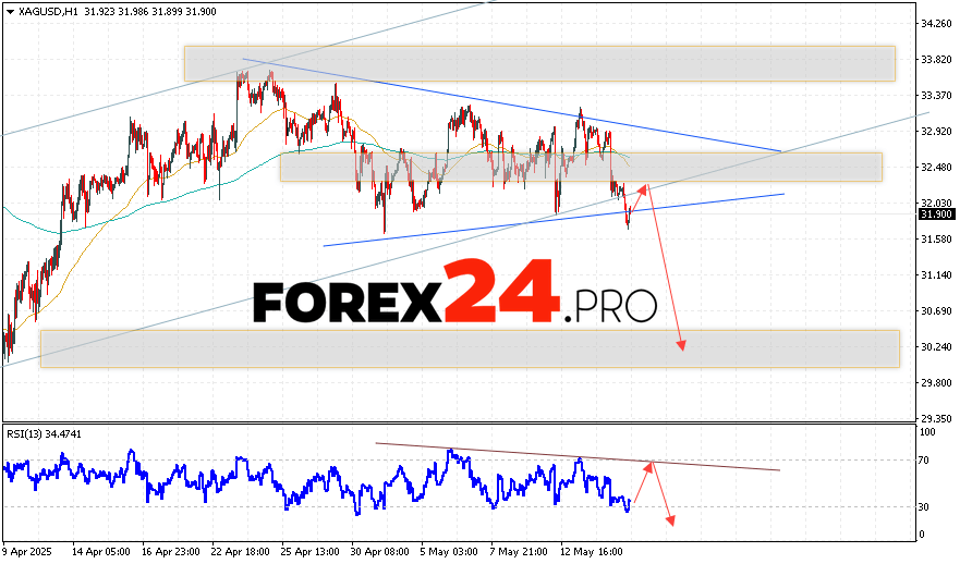 Silver Forecast XAGUSD for May 16, 2025 predicts a test of the resistance area near the level of 32.35. Then, continuation of price drops with a target below the level of 30.25. Cancellation of the option of silver prices dropping will be a strong rise and penetration through the level of 33.05. This indicates a break above the resistance area. In this case, one should expect the continuation of an increase in the price of silver with a target at the level of 35.45.
