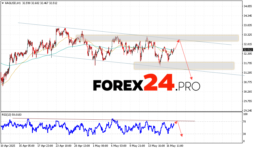 Silver Forecast XAGUSD for May 20, 2025 suggests a test of the resistance area near level 32.85. Following this, continuation of price drop with target below level 30.75. Cancellation of the option of silver prices decline will be strong growth and breaking the level 33.65. This indicates breaking the resistance area. In that case, it is expected to see a continuation of the rise in silver price’s value up to level 36.35.