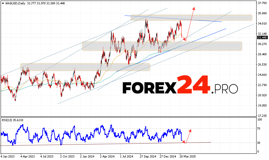 Silver Weekly Forecast April 7 — 11, 2025 suggests an attempt to test the support level near the area of 30.35. Then, the continuation of the growth of Silver prices with a target above the level of 36.65. The test of the trend line on the relative strength indicator will be in favor of the rise. The cancellation of the growth option for XAG/USD will be a fall and a breakout of the level of 30.55. This will indicate a continuation of the decline in quotes to the area below the level of 27.25.