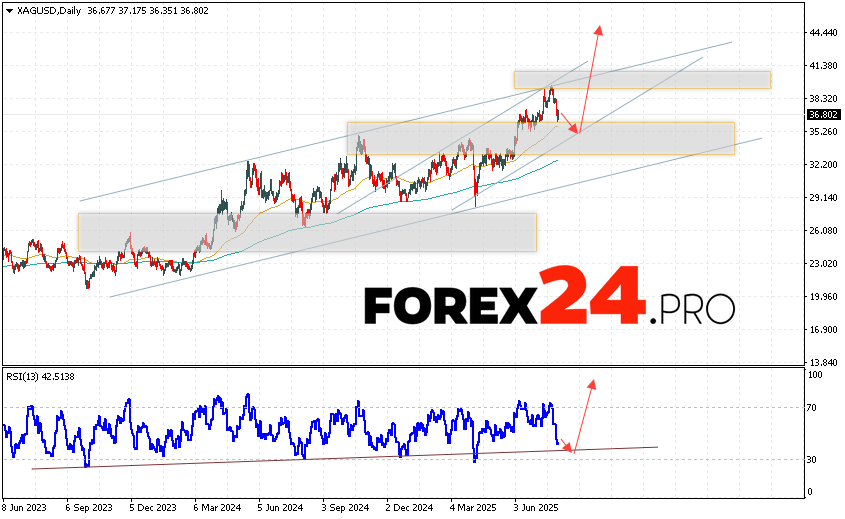 A rebound from the support line on the relative strength indicator will favor the growth of silver quotes and prices in the current trading week of August 4-8, 2025. The second signal will be a rebound from the lower border of the bullish channel. A decline and breakout of the 32.35 area will negate the XAG/USD growth scenario. This will indicate a breakout of the support area and a continuation of the decline in silver prices with a target below 30.65. Confirmation of growth will be a breakout of the resistance level and a close above 41.95.