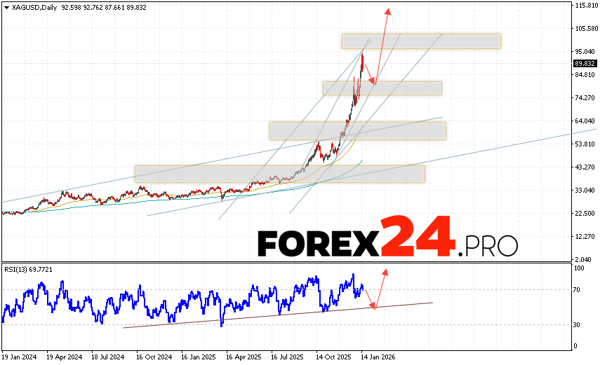 A rebound from the support line on the relative strength indicator (RSI) will signal an upward trend in silver prices during the current trading week (January 19-23, 2026). A rebound from the lower boundary of the bullish channel will be a second signal. A decline and breakout of the 72.05 area will cancel out the upward trend in XAG/USD. This will indicate a breakout of the support area and a continued decline in silver prices with a target below 65.65. A breakout of the resistance level and a price close above 96.35 will confirm continued growth.