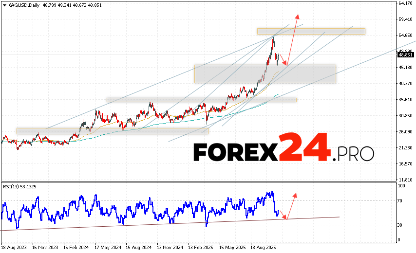 A rebound from the support line on the relative strength indicator (RSI) will support upward price movements in silver quotes and prices during the current trading week (November 3-7, 2025). The second signal will be a rebound from the lower boundary of the bullish channel. A decline and a breakout of the 43.55 area would cancel the upward trend for XAG/USD. This would indicate a breakout of the support area and a continued decline in silver prices with a target below 39.55. A breakout of the resistance level and a price close above 50.05 would confirm continued growth.