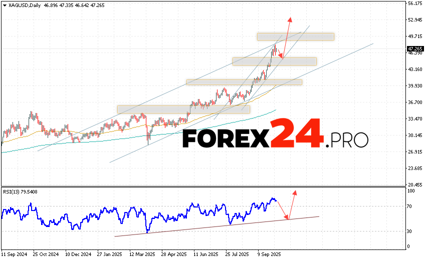 A rebound from the support line on the relative strength indicator (RSI) will signal an upward trend in silver quotes and prices during the current trading week (October 6 — 10, 2025). A rebound from the lower boundary of the bullish channel will be a second signal. A decline and breakout of the 42.75 area will cancel out the upward trend in XAG/USD quotes. This will indicate a breakout of the support area and a continued decline in silver prices with a target below 39.65. A breakout of the resistance level and a price close above 49.05 will confirm continued growth.