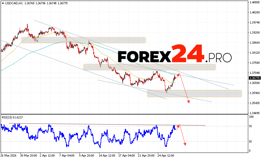 Canadian Dollar Forecast USD/CAD for April 29, 2026 suggests an attempt to test the resistance area near 1.3705. Subsequently, a continued decline below 1.3545. An additional signal favoring a decline in the Canadian Dollar on Forex will be a test of the resistance line on the relative strength indicator. A strong rally and a breakout of 1.3735 would cancel out the USD/CAD price decline. This would indicate continued price appreciation with a potential target above 1.3875.