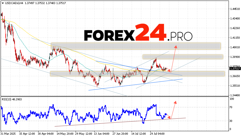 Canadian Dollar Forecast USD/CAD for August 12, 2025 suggests an attempt to test the support area near the level of 1.3735. Further, continued growth to the area above the level of 1.4025. An additional signal in favor of the rise of the Canadian Dollar on Forex will be a test of the support line on the relative strength indicator. The cancellation of the growth option of USD/CAD quotes will be a fall and a breakout of the level of 1.3625. This will indicate a continuation of the decline in the value of the asset with a potential target below the level of 1.3345.