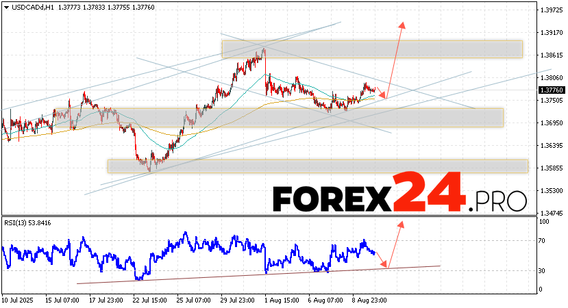 Canadian Dollar Forecast USDCAD for August 13, 2025 suggests an attempt to test the support area near the level of 1.3745. Further, continued growth to the area above the level of 1.3945. An additional signal in favor of the rise of the Canadian Dollar on Forex will be a test of the support line on the relative strength indicator. The cancellation of the growth scenario for USD/CAD quotes will be a fall and a breakout of the 1.3655 level. This will indicate a continued decline in the asset value with a potential target below the 1.3365 level.
