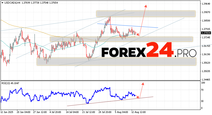 Canadian Dollar Forecast USD/CAD for August 14, 2025 suggests an attempt to test the support area near the level of 1.3735. Further, continuation of growth to the area above the level of 1.3965. An additional signal in favor of the rise of the Canadian Dollar on Forex will be a test of the support line on the relative strength indicator. The cancellation of the growth option for USD/CAD quotes will be a fall and a breakout of the level of 1.3645. This will indicate a continuation of the decline in the value of the asset with a potential target below the level of 1.3425.