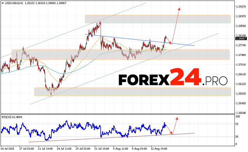 Canadian Dollar Forecast USD/CAD for August 15, 2025 suggests an attempt to test the support area near the 1.3775 level. Further, growth will continue to the area above the 1.3945 level. An additional signal in favor of the Canadian dollar’s rise on Forex will be a test of the support line on the relative strength indicator. A fall and breakout of the 1.3705 level will cancel the USD/CAD growth scenario. This will indicate a continuation of the asset’s decline with a potential target below the 1.3525 level.