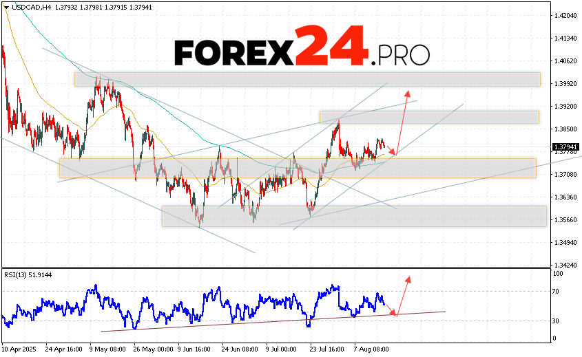 Canadian Dollar Forecast USD/CAD for August 19, 2025 suggests an attempt to test the support area near the 1.3775 level. Further, continued growth to the area above the 1.3965 level. An additional signal in favor of the Canadian Dollar’s growth on Forex will be a test of the support line on the relative strength indicator. The USD/CAD growth scenario will be cancelled if the pair falls and breaks through the 1.3665 level. This will indicate a continued decline in the asset value with a potential target below the 1.3435 level.