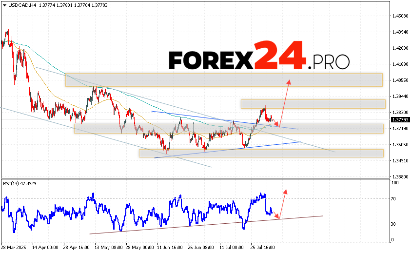 Canadian Dollar Forecast USD/CAD for August 6, 2025 suggests an attempt to test the support area near the 1.3725 level. Further, growth will continue to the area above the 1.4055 level. An additional signal in favor of the rise of the Canadian dollar on Forex will be a test of the support line on the relative strength indicator. A fall and breakout of the 1.3625 level will cancel the USD/CAD growth scenario. This will indicate a continuation of the decline in the asset’s value with a potential target below the 1.3445 level.