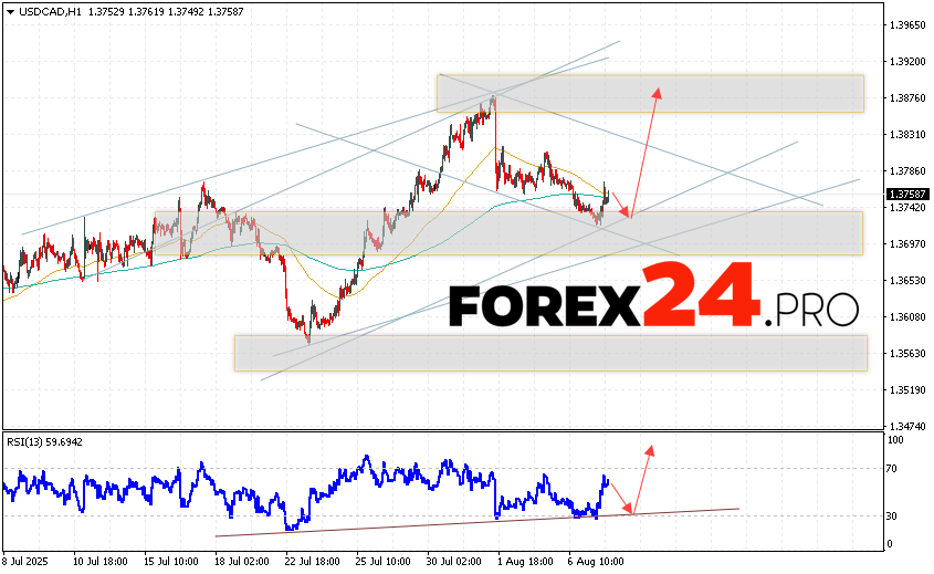 Canadian Dollar Forecast USD/CAD for August 8, 2025 suggests an attempt to test the support area near the 1.3735 level. Further, growth will continue to the area above the 1.3895 level. An additional signal in favor of the rise of the Canadian dollar on Forex will be a test of the support line on the relative strength indicator. A fall and breakout of the 1.3655 level will cancel the USD/CAD growth scenario. This will indicate a continuation of the decline in the asset’s value with a potential target below the 1.3325 level.