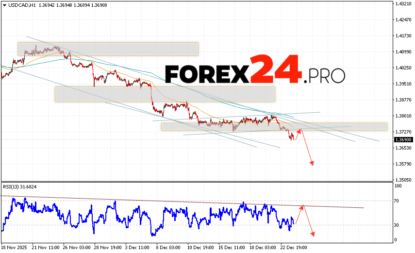 Canadian Dollar Forecast USD/CAD for December 24, 2025 suggests an attempt to test the resistance area near 1.3725. Subsequently, a continued decline below 1.3575 is expected. An additional signal supporting a decline in the Canadian dollar on Forex will be a test of the resistance line on the relative strength indicator. A strong rally and a breakout of 1.3845 would cancel out the downward trend in USD/CAD. This would indicate continued price appreciation with a potential target above 1.4025.