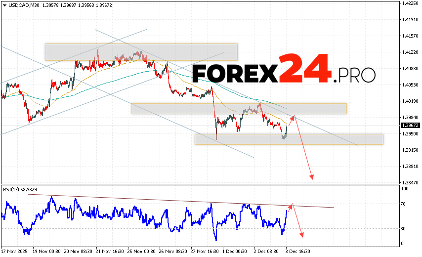 Canadian Dollar Forecast USD/CAD for December 4, 2025 suggests an attempt to test the resistance area near 1.3975. Subsequently, a continued decline below 1.3845 is expected. An additional signal supporting a decline in the Canadian dollar on Forex will be a test of the resistance line on the relative strength indicator (RSI). A strong rally and a breakout of 1.4035 would cancel out the downward trend in USD/CAD. This would indicate continued growth in the asset’s price, with a potential target above 1.4265.