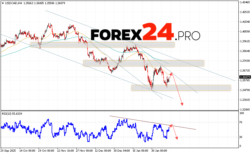 Canadian Dollar Forecast USD/CAD for February 13, 2026 suggests an attempt to test the resistance area near 1.3645. Subsequently, a continued decline below 1.3365 is expected. An additional signal supporting a decline in the Canadian dollar on Forex will be a test of the resistance line on the relative strength indicator (RSI). A strong rally and a breakout of 1.3695 would cancel out the downward trend in USD/CAD. This would indicate continued price appreciation with a potential target above 1.4085.