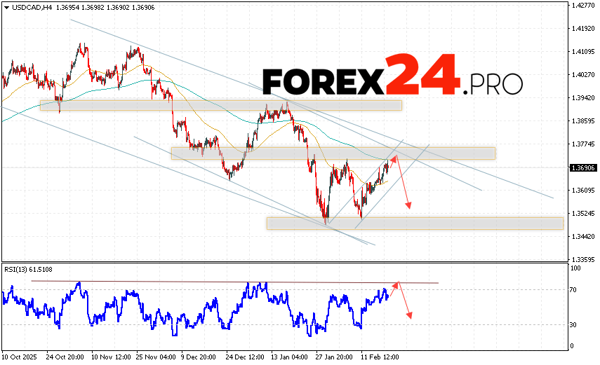 Canadian Dollar Forecast USDCAD for February 20, 2026 suggests an attempt to test the resistance area near 1.3715. Further declines are expected below 1.3525. A test of the resistance line on the relative strength indicator (RSI) will further signal a decline in the Canadian dollar on Forex. A strong rally and a breakout of 1.3845 would cancel out the downward trend in USD/CAD. This would indicate continued price appreciation with a potential target above 1.4025.