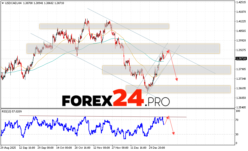 Canadian Dollar Forecast USD/CAD for January 13, 2026 suggests an attempt to test the resistance area near 1.3925. Further declines are expected below 1.3725. A test of the resistance line on the relative strength indicator (RSI) will be an additional signal for the Canadian dollar to decline on Forex. A strong rally and a breakout of 1.3975 would cancel out the downward trend in USD/CAD. This would indicate continued declines in the asset’s value, with a potential target below 1.4085.