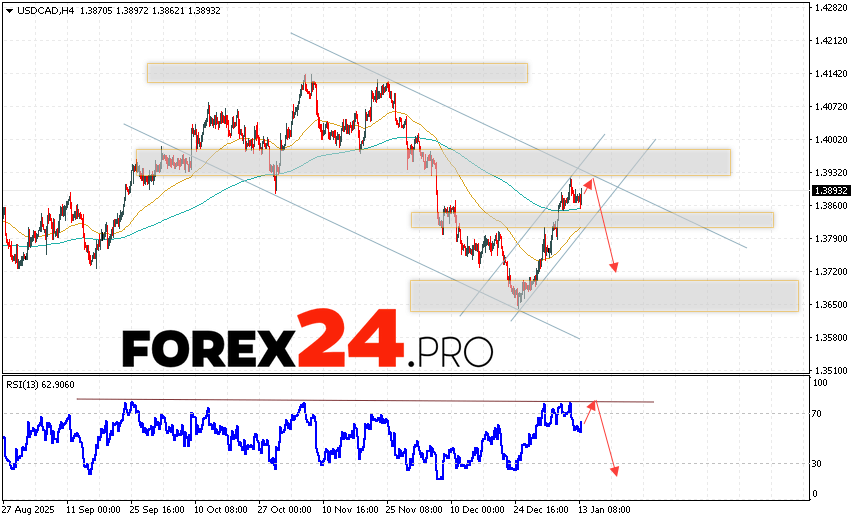 Canadian Dollar Forecast USD/CAD for January 14, 2026 suggests an attempt to test the resistance area near 1.3915. Further declines are expected below 1.3720. A test of the resistance line on the relative strength indicator (RSI) will be an additional signal for the Canadian dollar to decline on Forex. A strong rally and a breakout of 1.3985 would cancel out the downward trend in USD/CAD. This would indicate continued declines in the asset’s value, with a potential target below 1.4125.