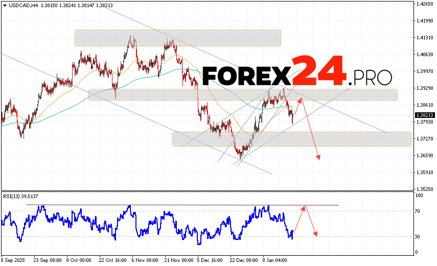 Canadian Dollar Forecast USD/CAD for January 22, 2026 suggests an attempt to test the resistance area near 1.3865. Further declines are expected below 1.3655. A test of the resistance line on the relative strength indicator (RSI) will be an additional signal for a decline in the Canadian dollar on Forex. A strong rally and a breakout of 1.4005 would cancel out the downward trend in USD/CAD. This would indicate continued declines in the asset’s value, with a potential target below 1.4185.