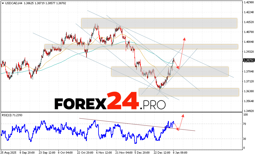 Canadian Dollar Forecast USD/CAD for January 9, 2026 suggests an attempt to test the support area near 1.3790. Further growth is expected to continue above 1.4015. A test of the support line on the relative strength indicator (RSI) will be an additional signal in favor of the Canadian dollar’s growth on Forex. A decline and a break of 1.3715 will cancel out the upward trend in USD/CAD quotes. This will indicate continued decline in the asset’s price, with a potential target below 1.3565.