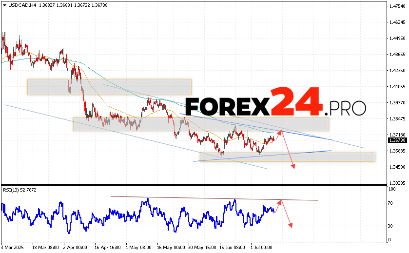 Canadian Dollar Forecast USD/CAD for July 11, 2025 suggests an attempt to test the resistance area near the 1.3715 level. Further, the decline will continue to the area below the 1.3465 level. An additional signal in favor of a decline in the Canadian dollar on Forex will be a test of the resistance line on the relative strength indicator. A strong rise and a breakout of the 1.3805 level will cancel the option of a decline in USD/CAD quotes. This will indicate a continuation of the asset’s rise with a potential target above the 1.3945 level.